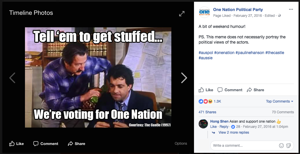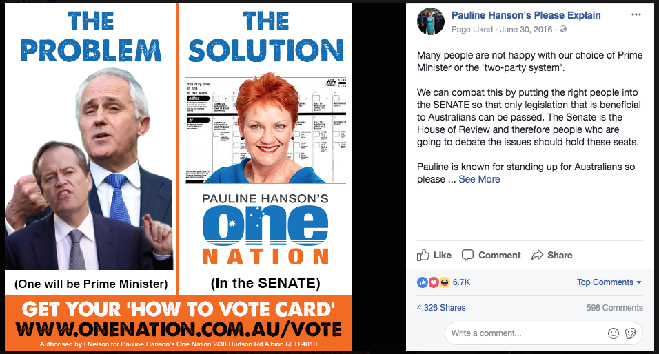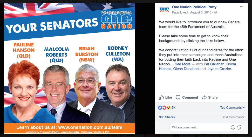 One Nation and Ms Hanson’s popularity continued to grow and so did their Facebook reach, with millions of Australians listening to their message in the lead up to the July 2016 Federal election. At that election, Ms Hanson won her QLD Senate seat and the party secured 4 Senate seats, across the country.